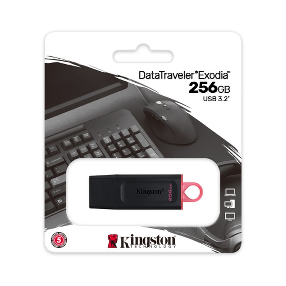 The Kingston DataTraveler Exodia 256GB USB 3.2 is a portable flash drive designed for everyday storage and data transfer. It is suitable for laptops, desktops, and other digital devices.